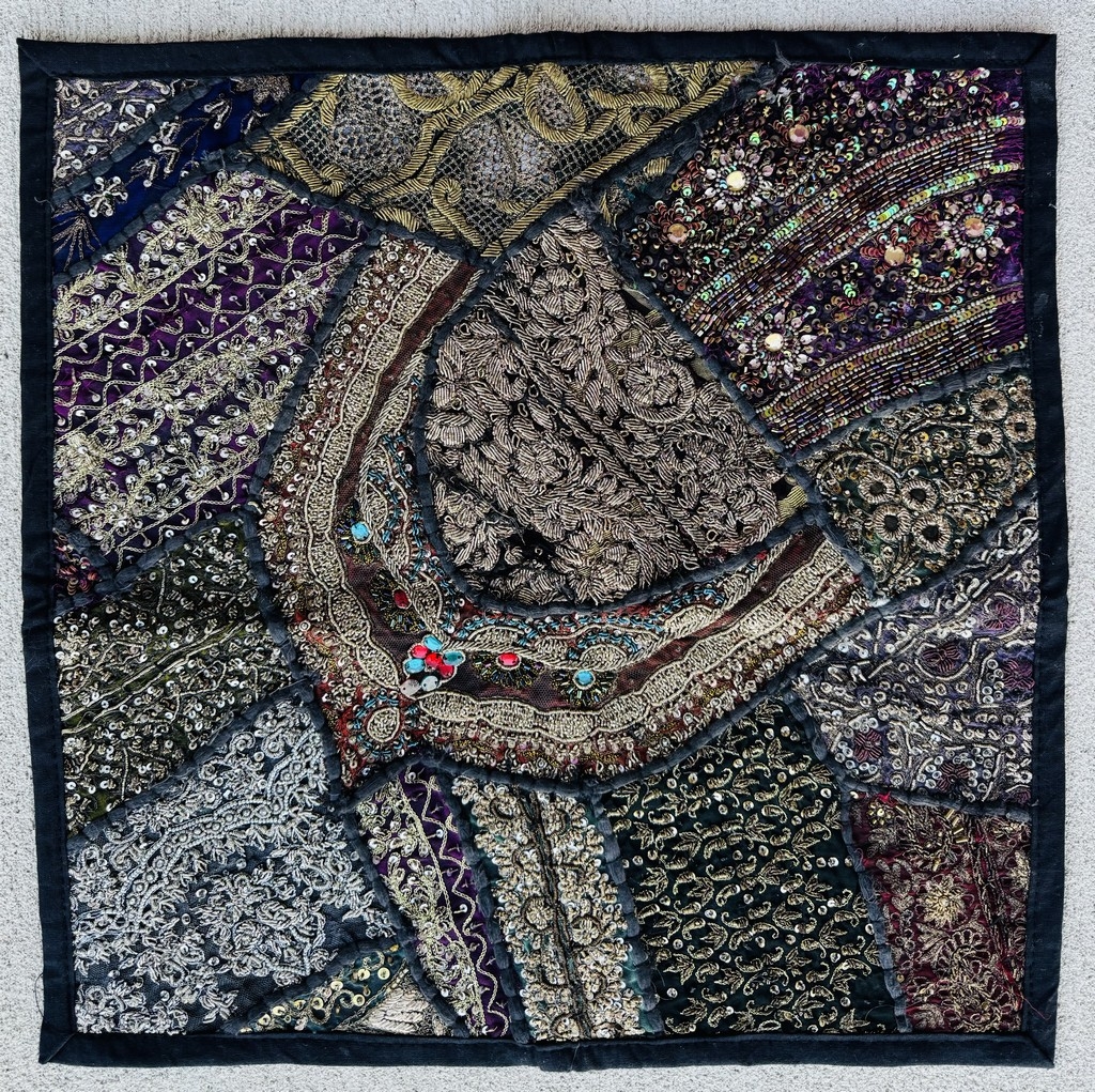 Zardozi,字面意思是「黃金刺繡」,起源於波斯,以金屬線、金箔、細珠繡在絲絨或錦緞上。它在十四世紀傳入印度,在蒙兀兒帝國十七世紀鼎盛期,於阿克巴皇帝的庇護下達到頂峰。皇帝長袍、象鞍覆布、寺廟帷幕,全出自這些工匠之手。